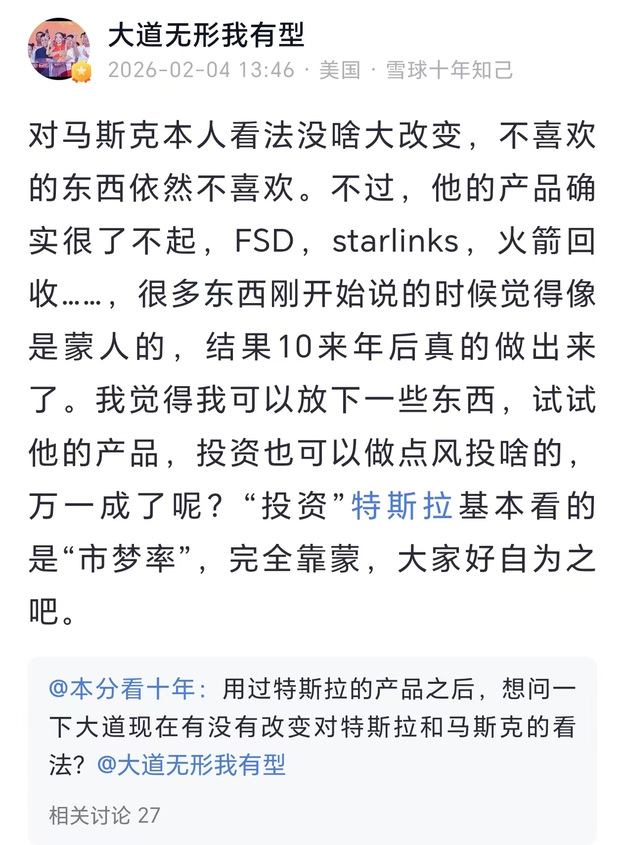 随后,有网友提问,在用过特斯拉的产品之后,有没有改变对特斯拉和马斯克的看法?段永平对此回复称,对马斯克本人的看法没啥大改变,不过“他的产品确实很了不起,FSD,starlinks,火箭回收……,很多东西刚开始说的时候觉得像是蒙人的,结果10来年后真的做出来了。我觉得我可以放下一些东西,试试他的产品,投资也可以做点风投啥的”。但段永平认为,“投资”特斯拉基本看的是“市梦率”,完全靠蒙。