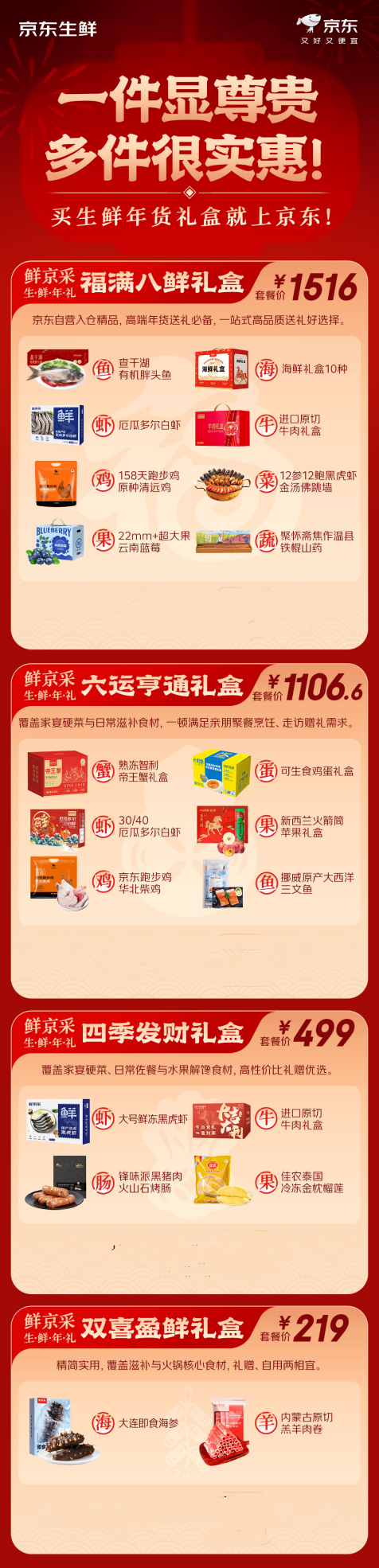 为了让消费者能更实惠地将各色年货礼盒带回家,京东生鲜还特别推出了聚合型年货礼盒套装,打造高性价比购买方案。其中,鲜京采福满八鲜礼盒精选查干湖有机胖头鱼、厄瓜多尔白虾、清远跑步鸡、云南蓝莓等8款优质礼盒,是高端赠礼的体面之选;六运亨通礼盒涵盖帝王蟹、跑步鸡、三文鱼等宴客硬菜与日常食材,轻松满足亲友聚餐与走亲访友的双重需求;四季发财礼盒精选黑虎虾、原切牛肉、金枕榴莲等兼具品质与实用性的美味;双喜盈门礼盒则聚焦即食海参与羔羊肉卷,精简实用,无论是赠礼还是自家享用都十分合适。