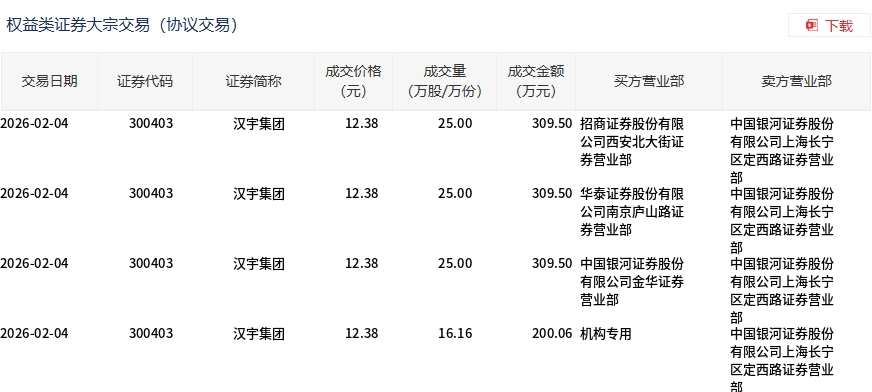 2月4日,汉宇集团大宗交易成交91.16万股,成交额1128.56万元,占当日总成交额的6.02%,成交价12.38元,较市场收盘价13.78元折价10.16%。