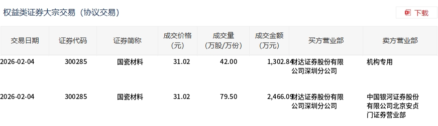 2月4日,国瓷材料大宗交易成交121.5万股,成交额3768.93万元,占当日总成交额的4.4%,成交价31.02元,较市场收盘价31.02元持平。