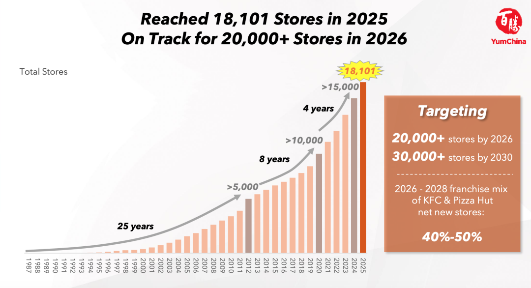 展望2026年,百胜中国的目标是门店总数超20000家, 即净新增门店超1900家;肯德基和必胜客净新增门店中加盟店的占比均达到40%-50%;资本支出约在6亿至7亿美元之间,向股东回馈15亿美元。