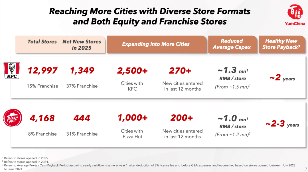 分品牌来看,2025年全年,肯德基系统销售额同比增长5%;同店销售额同比增长1%;经营利润同比增长8%至13亿美元;餐厅利润率为17.4%,同比增长50个基点,主要得益于有利的原材料价格和运营精简,部分被因外卖占比提升而增加的骑手成本和高性价比产品所抵消。门店方面,截至2025年末,肯德基门店总数达12997家,其中加盟店占比15%;2025年肯德基净新增门店1349家,其中加盟店净新增504家,占比37%。
