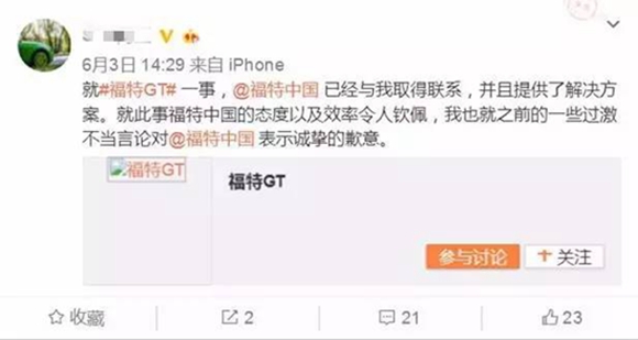 好在,张先生的曝光终于有了回应。6月3日,张先生发微博称:福特中国与其进行了联系,并提供了解决方案。这次福特GT“加价门”,也算是告一段落。