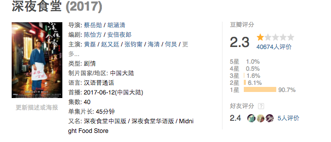 和所有的国产翻拍剧一样,《深夜食堂》华语版一开播就收获了滔滔不绝的差评,豆瓣评分只有惨不忍睹的2.3分。