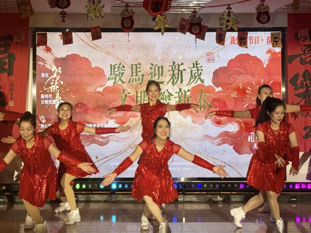 演出节目亦处处体现“校社共育”的匠心。上海济光职业技术学院的舞蹈《五彩彝裳》舞出民族绚烂,同济大学京剧社的《贵妃醉酒》演绎国粹华美,教工越剧社的《经典流派联唱》则展现戏曲流派的多样韵味。而定海路街道“俏姐妹”舞蹈团带来的现代舞《青春在线》,则以跃动的节奏勾勒出社区新时代的活力风貌。