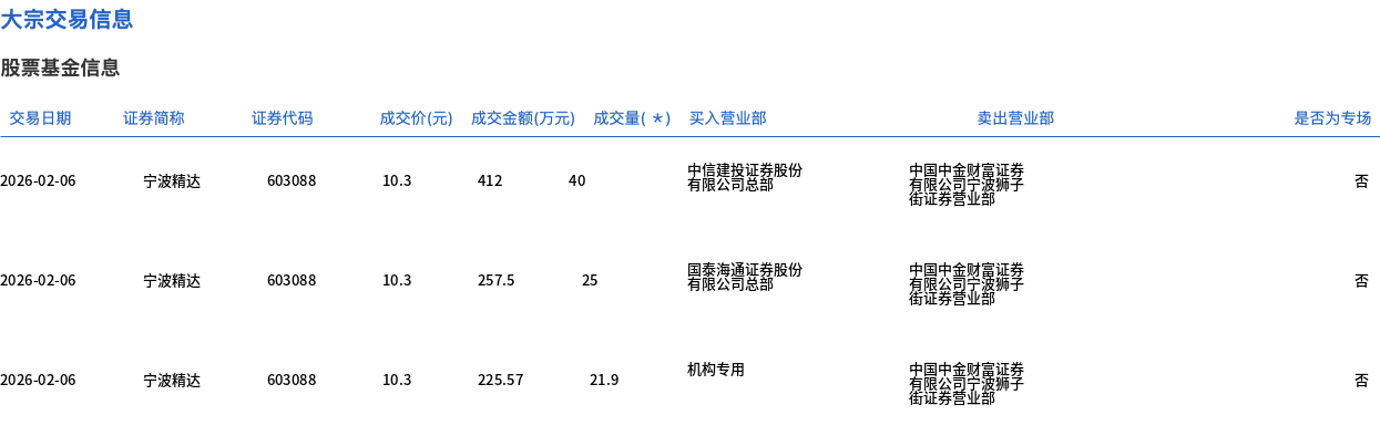 2月6日,宁波精达大宗交易成交86.9万股,成交额895.07万元,占当日总成交额的6.68%,成交价10.3元,较市场收盘价11.44元折价9.97%。