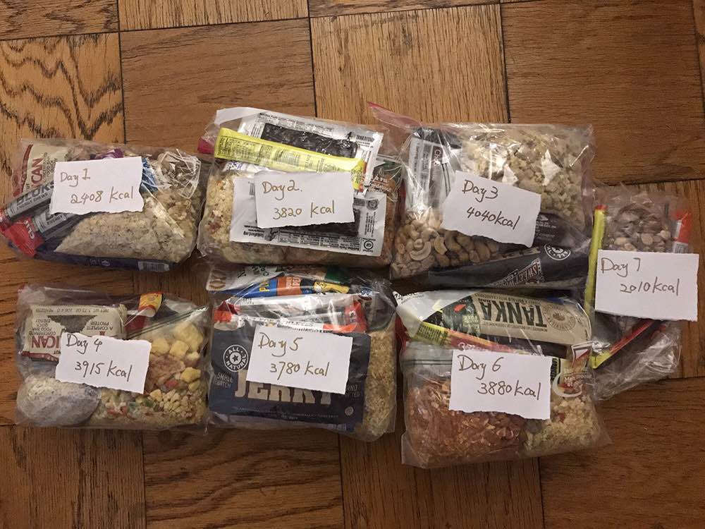 在愁云惨淡的心理建设期间,我进行了一系列不劳身但很劳神的赛前准备。比如研究热量最高的轻便食品,如何处理被毒蛇咬过的伤口等等。MDS强制要求每日携带两千大卡的食物。我尝试在不怎么运动的工作日,一天吃两千卡的食物,结果夜里险些饿醒。于是我只好装上更多的口粮,每天三千五百卡,随每日赛程上下起伏。我把食品包装抠下来,研究多少蛋白质脂肪和糖分。不能沉死,也不能饿死,还得营养均衡。我煞有介事整了一个Excel表,花了许多日夜,排列组合出了自以为优的组合。险些需要为此写个程序。