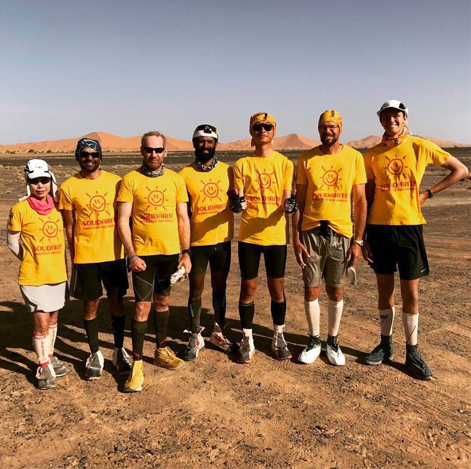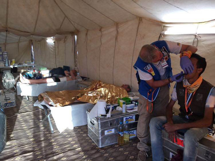 第二种是医生,也都是志愿者,同样一水法国人,穿蓝色马甲。日后我们会发现其中不少都会成为我们的恩人。他们在赛道各个检查站监控选手的状况,并且提供紧急医疗援助,看谁状态不好,要退赛打点滴,或者被直升机送到卡萨布兰卡救助。比赛结束他们会在营地里设立医疗帐篷,处理数百只长着水泡或者血泡的脚,为被背包磨烂的肩膀包扎。他们任劳任怨,往往工作到夜里,还能用破碎但充满激情的英语激励愁眉苦脸的选手。
