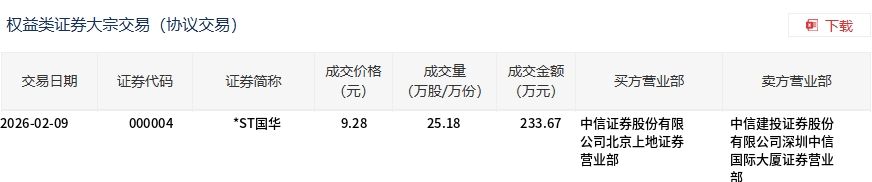 *ST国华今日大宗交易平价成交25.18万股,成交额233.67万元