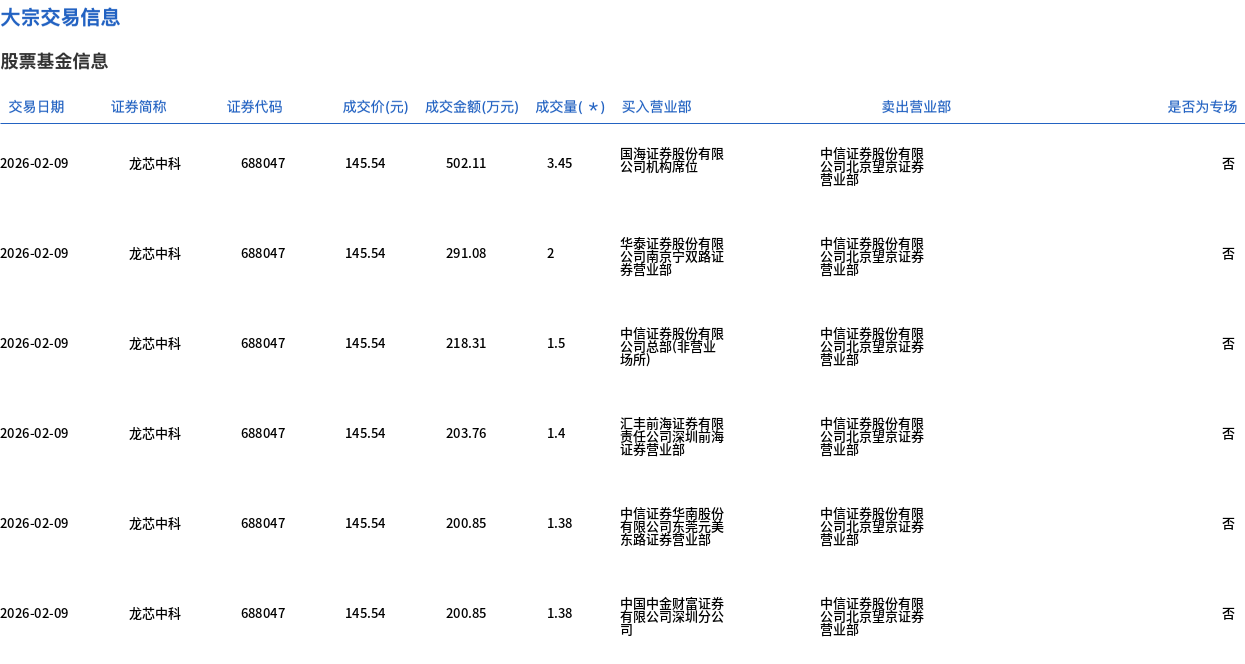 2月9日,龙芯中科大宗交易成交77.78万股,成交额1.19亿元,占当日总成交额的6.12%,成交均价152.51元,较市场收盘价162.65元折价6.24%,其中最高成交价161.02元,最低成交价145.54元。