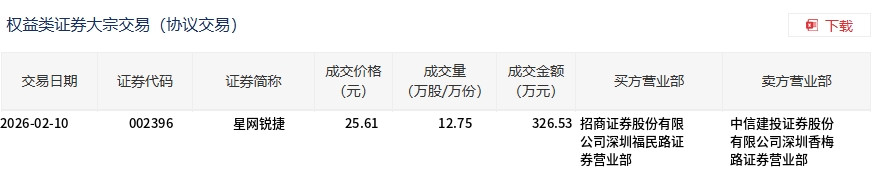 2月10日,星网锐捷大宗交易成交12.75万股,成交额326.53万元,占当日总成交额的0.79%,成交价25.61元,较市场收盘价28.96元折价11.57%。