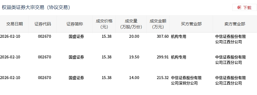 2月10日,国盛证券大宗交易成交53.5万股,成交额822.83万元,占当日总成交额的2.29%,成交价15.38元,较市场收盘价16.36元折价5.99%。