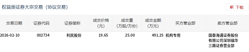 2月10日,利民股份大宗交易成交25万股,成交额491.25万元,占当日总成交额的0.93%,成交价19.65元,较市场收盘价19.65元持平。