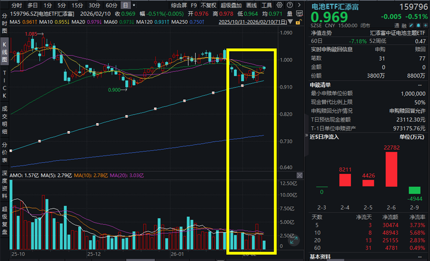 2月10日,A股市场震荡上行,沪指收涨0.13%,电池板块小幅回调。截至收盘,同类规模领先、费率最低档的电池ETF汇添富(159796)跌0.51%,终结两连阳。资金持续涌入电池板块,电池ETF汇添富(159796)近5日吸金超3亿元。