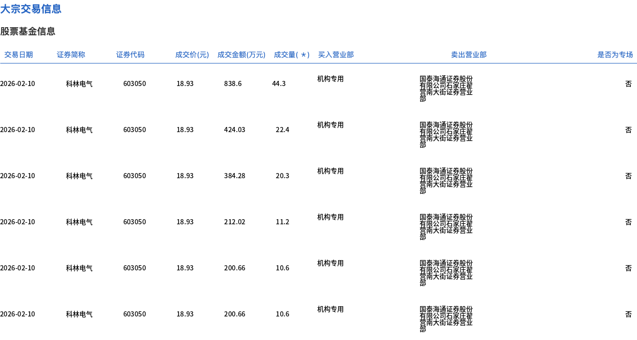 2月10日,科林电气大宗交易成交130万股,成交额2460.91万元,占当日总成交额的28.77%,成交价18.93元,较市场收盘价20.61元折价8.15%。