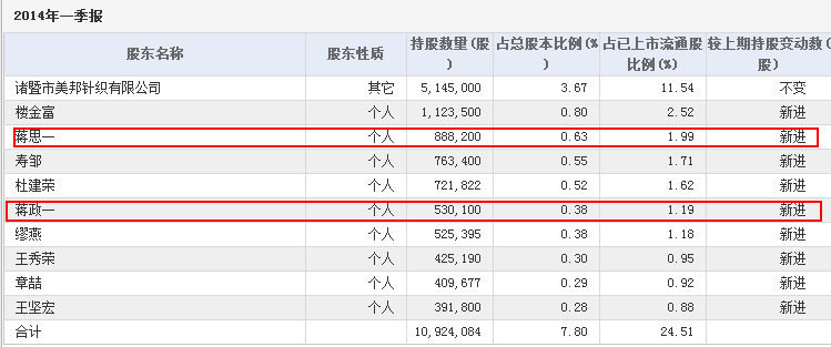 此外,统计数据显示,“蒋氏搭档”在2014年2季度时,共入围四家上市公司十大流通股东序列,蒋政一持有万达信息(300168.SZ)2369.53万股,蒋思一则持有亚太药业(002370.SZ)150.75万股。