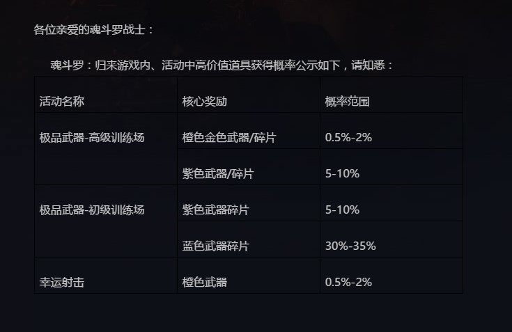 根据官方公布的抽奖概率来看,橙色金色武器的抽取概率为0.5%-2%,玩家们在“高级训练场”抽奖一次需要消耗168钻石(1元=10钻石)。也就是说,玩家们最多需要花费超过3000元才能获得一把橙色武器,而且还无法决定武器的种类。