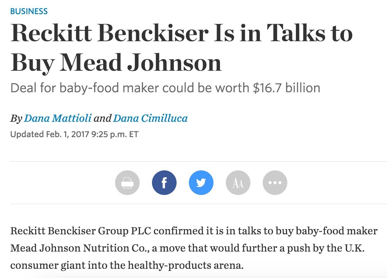 2017年2月1日,消息灵通的《华尔街日报》在收盘之后在网上发布了一篇报道,该报道第二天刊登在报纸上,随后全球其他印刷和电子出版物纷纷转载或跟进。该报道说,利洁时正在和美赞臣洽谈收购事宜。