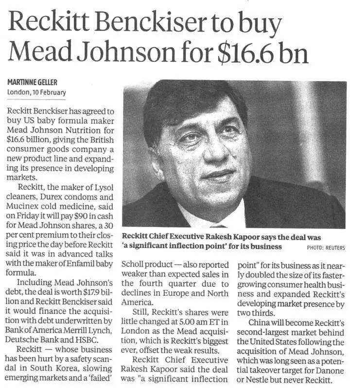 英国快消巨头、杜蕾斯和滴露的母公司利洁时(Reckitt Benckiser)收购美国奶粉商美赞臣(Mead Johnson Nutrition)一事,将在今日正式完成。一连两天,小食代带大家一起来解密这起重磅收购的“幕后大戏”。昨天发布了上篇,错过的朋友可以回顾一下剧情。