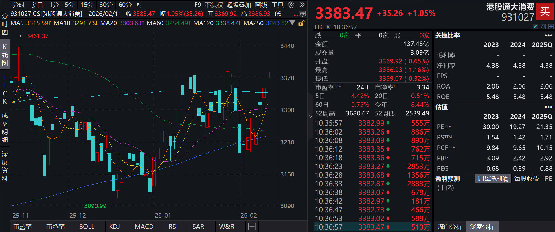 截至2026年2月11日 10:36,港股通大消费指数(931027)强势上涨1.05%,成分股创科实业(00669)上涨6.91%,思摩尔国际(06969)上涨5.63%,比亚迪股份(01211)上涨3.97%,小鹏汽车-W(09868),药明合联(02268)等个股跟涨。