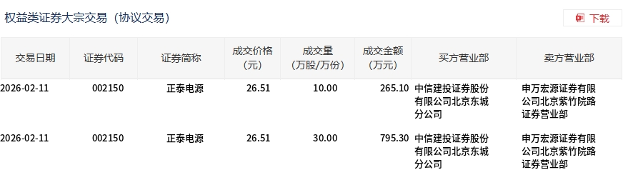 2月11日,正泰电源大宗交易成交40万股,成交额1060.4万元,占当日总成交额的1.3%,成交价26.51元,较市场收盘价28.81元折价7.98%。