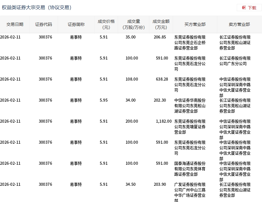 2月11日,易事特大宗交易成交711.5万股,成交额4206.33万元,占当日总成交额的25.57%,成交均价5.91元,较市场收盘价6.57元折价10.02%,其中最高成交价5.95元,最低成交价5.91元。