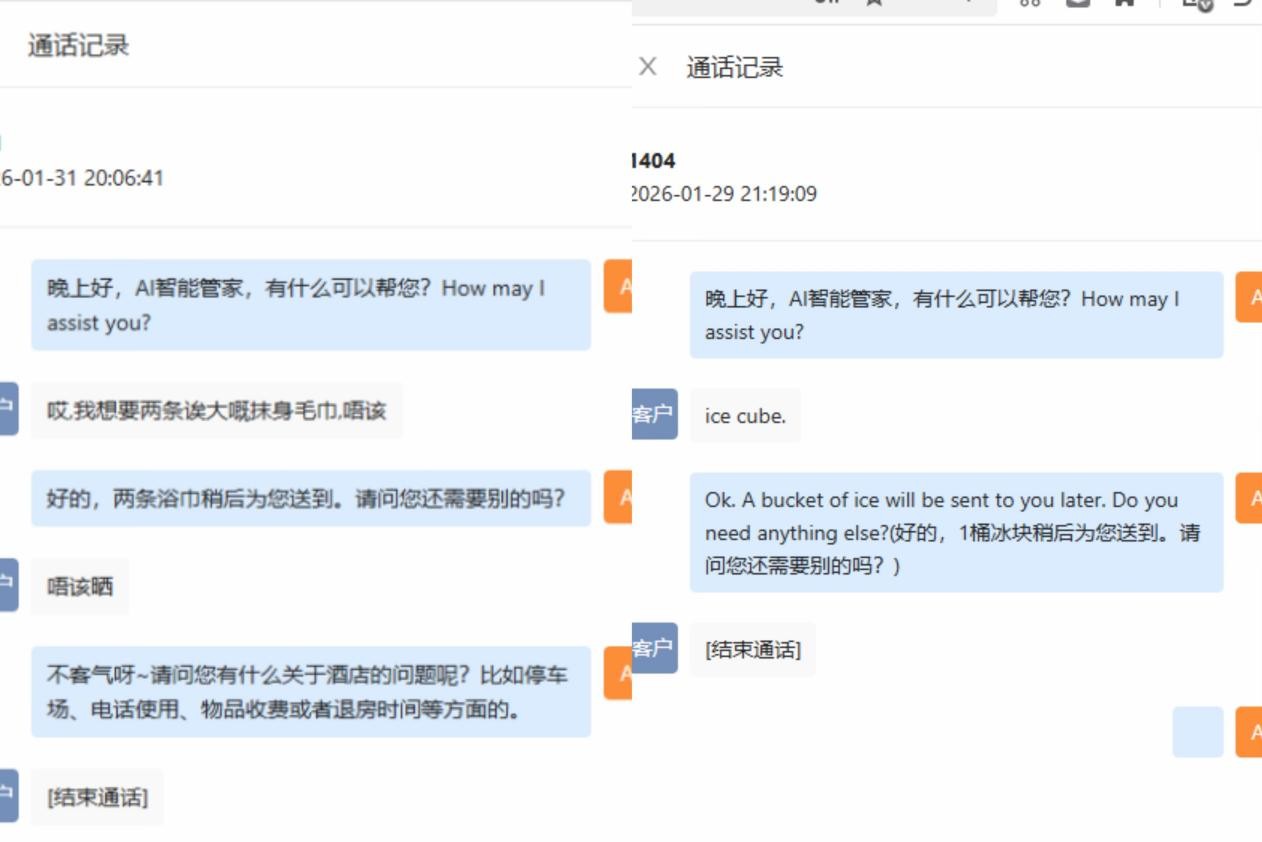 从 WiFi 信息、天气状态、早餐信息等高频问询,到牙刷、拖鞋、矿泉水补给,外卖、快递配送,设备报修等客需话务,均是实时毫秒级应答,精准承接千余种宾客服务需求。