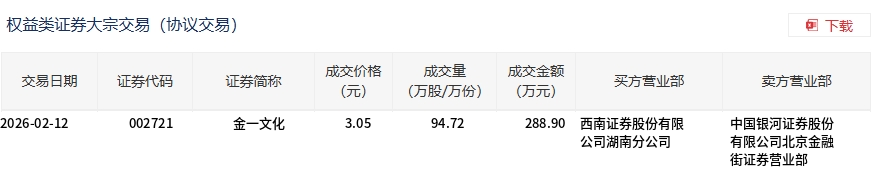 2月12日,金一文化大宗交易成交94.72万股,成交额288.9万元,占当日总成交额的1.6%,成交价3.05元,较市场收盘价3.31元折价7.85%。