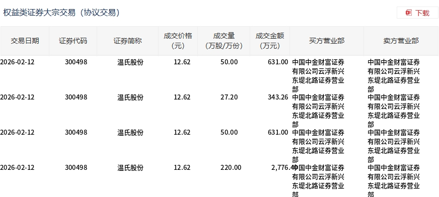2月12日,温氏股份大宗交易成交347.2万股,成交额4381.66万元,占当日总成交额的7.44%,成交价12.62元,较市场收盘价15.54元折价18.79%。