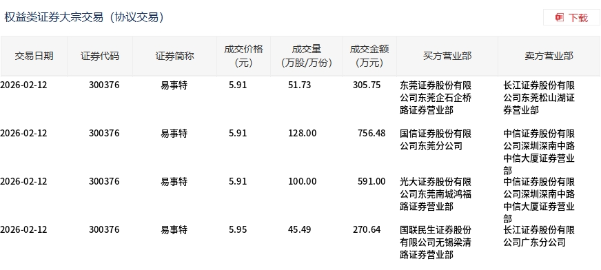 2月12日,易事特大宗交易成交325.22万股,成交额1923.87万元,占当日总成交额的7.93%,成交均价5.92元,较市场收盘价6.76元折价12.49%,其中最高成交价5.95元,最低成交价5.91元。