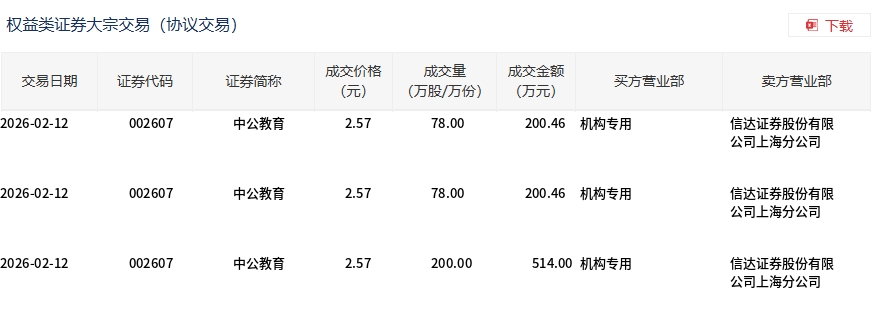 2月12日,中公教育大宗交易成交356万股,成交额914.92万元,占当日总成交额的2.07%,成交价2.57元,较市场收盘价2.82元折价8.87%。