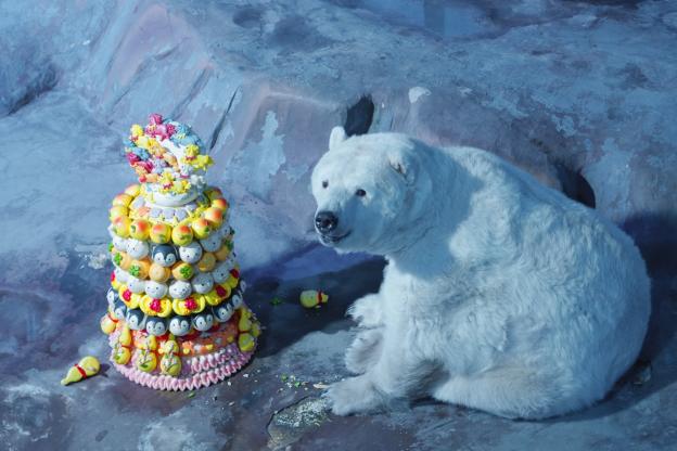 活动中,北极熊“欢欢”的定制年夜饭吸引众多游客驻足。这款高达一米的花饽饽由胶东非遗传承人手工制作,以天然蔬果汁着色,顶端精心塑造出“万马奔腾”的面塑造型,气势生动,寓意新的一年奔腾向前、奋进不止;其下方则环绕着企鹅、海豹、海豚、苹果、福袋、寿桃等造型,既展现地方非遗技艺,也传递出浓浓年味与新春祝福。现场游客纷纷举起手机,记录下“欢欢”大快朵颐的憨萌姿态,在欢声笑语中感受“马上开心”的新春祝福。