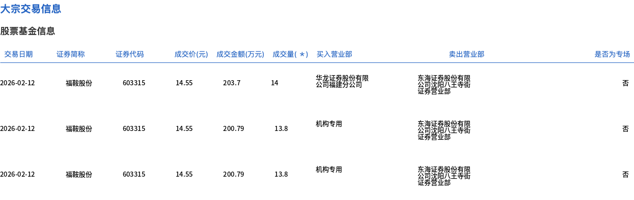 2月12日,福鞍股份大宗交易成交85.6万股,成交额1245.48万元,占当日总成交额的4.11%,成交价14.55元,较市场收盘价16.27元折价10.57%。