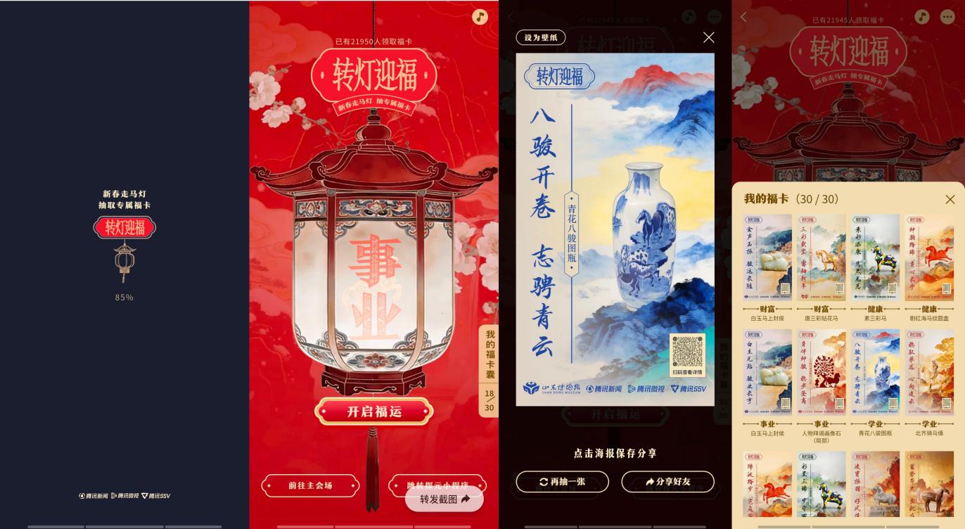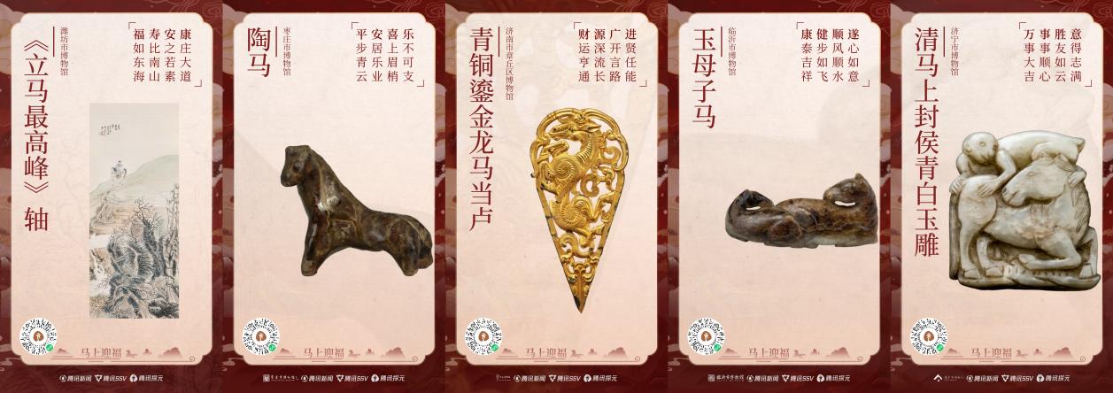 癸卯岁末,丙午马年新春将至,由腾讯SSV数字文化实验室联合腾讯新闻推出的“新春走马灯”全国文旅融合活动火热启幕。本次活动以“马”为主题,联动全国近50家博物馆、100余件文物打造数字福卡,实现线上线下沉浸式文化体验。其中,山东博物馆、滕州市汉画像石馆、枣庄市博物馆、潍坊市博物馆、临沂市博物馆、济宁市博物馆、济南市章丘区博物馆七家文博机构参与,延续“科技+文物”创新模式,以数字技术为桥,让齐鲁大地的文物“活”起来,为马年新春注入浓郁的文化年味,持续推动山东文物活态传承与全民守护。