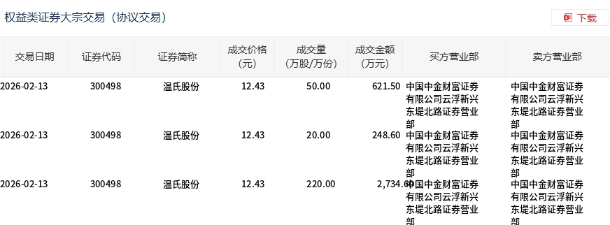 2月13日,温氏股份大宗交易成交290万股,成交额3604.7万元,占当日总成交额的6.56%,成交价12.43元,较市场收盘价15.4元折价19.29%。