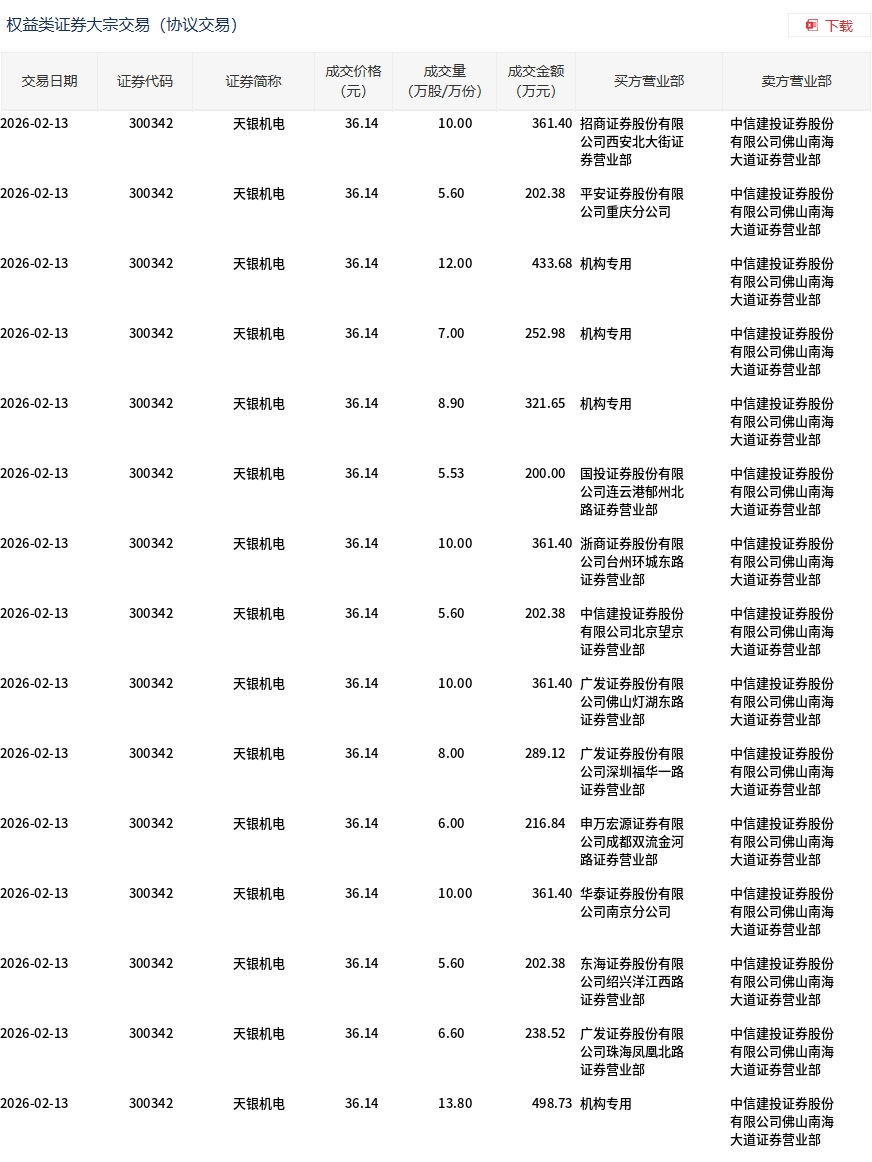 2月13日,天银机电大宗交易成交124.63万股,成交额4504.26万元,占当日总成交额的2.41%,成交价36.14元,较市场收盘价45.6元折价20.75%。