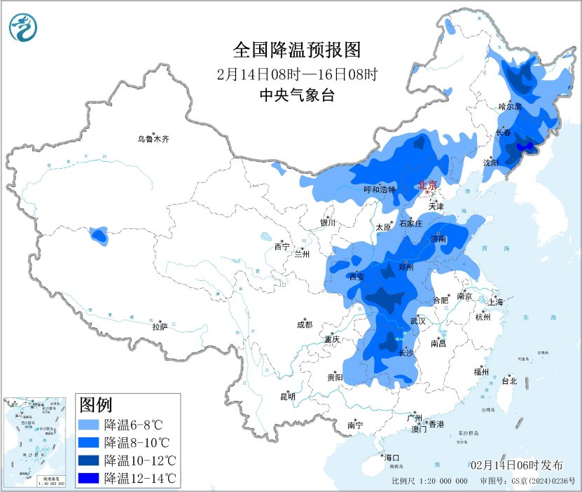 预计,2月14日08时至16日08时,内蒙古中部、东北地区中东部、华北大部、黄淮、陕西南部、江汉、江淮北部、江南西部等地气温下降6~10℃,其中,黑龙江中部、内蒙古中部、河南西部、湖北北部、湖南北部等地局地降温10~12℃。