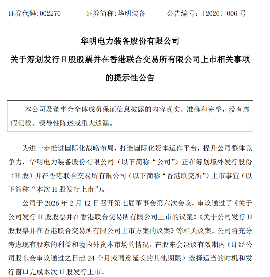 2月12日,华明装备(002270.SZ)公告称,为进一步推进国际化战略布局、打造国际化资本运作平台、提升公司整体竞争力,公司正在筹划境外发行股份(H股)并在香港联合交易所有限公司上市事宜。