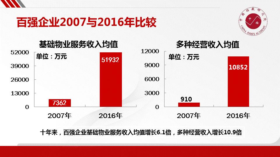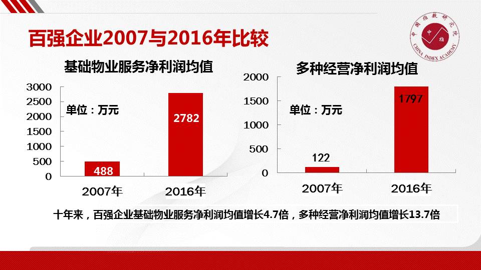 十年来,百强企业基础物业服务净利润均值增长4.7倍,多种经营净利润均值增长13.7倍。