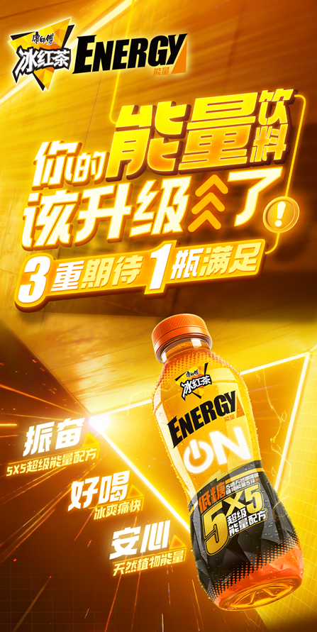 不仅如此,康师傅冰红茶Energy的包装设计,同样让人眼前一亮:整体色调充满动感能量和活力因子,更符合年轻人的审美;充满力量感的“Energy”字体与“ON”键组成产品的超级符号,带来强大的视觉冲击力和超强的能量想象,一瓶在手,随时启动,让能量一触即发。