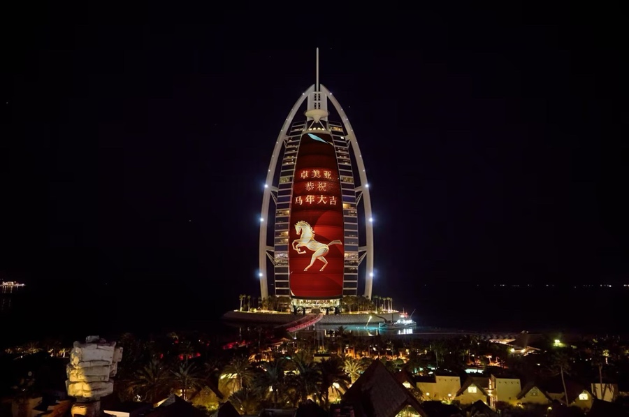 全球最高的哈利法塔,马年主题灯光秀震撼开演,璀璨光影搭配暖心中文祝福,在世界之巅向咱送上新春问候,拍照打卡氛围感直接拉满;迪拜眼摩天轮推出春节主题下午茶,坐在高空尝着精致茶点,俯瞰迪拜城市风光,惬意又浪漫;卓美亚帆船酒店更是联手中国纸艺艺术家打造新春惊喜,帆形外墙播放剪纸动画,餐饮区的金鱼纸艺装置演绎“金玉满堂”的美好寓意,逛酒店也能感受中式浪漫。