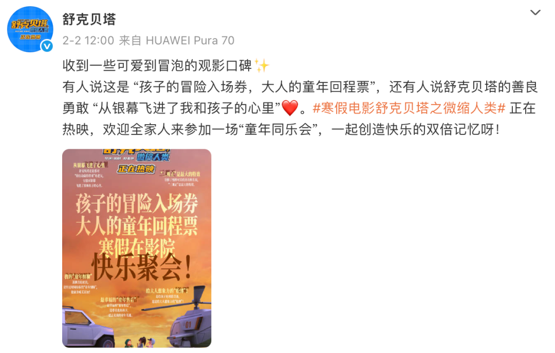 动画片《舒克贝塔之微缩人类》主打“寒假亲子观影”,兼顾了儿童对动画的喜好与家长的怀旧需求。