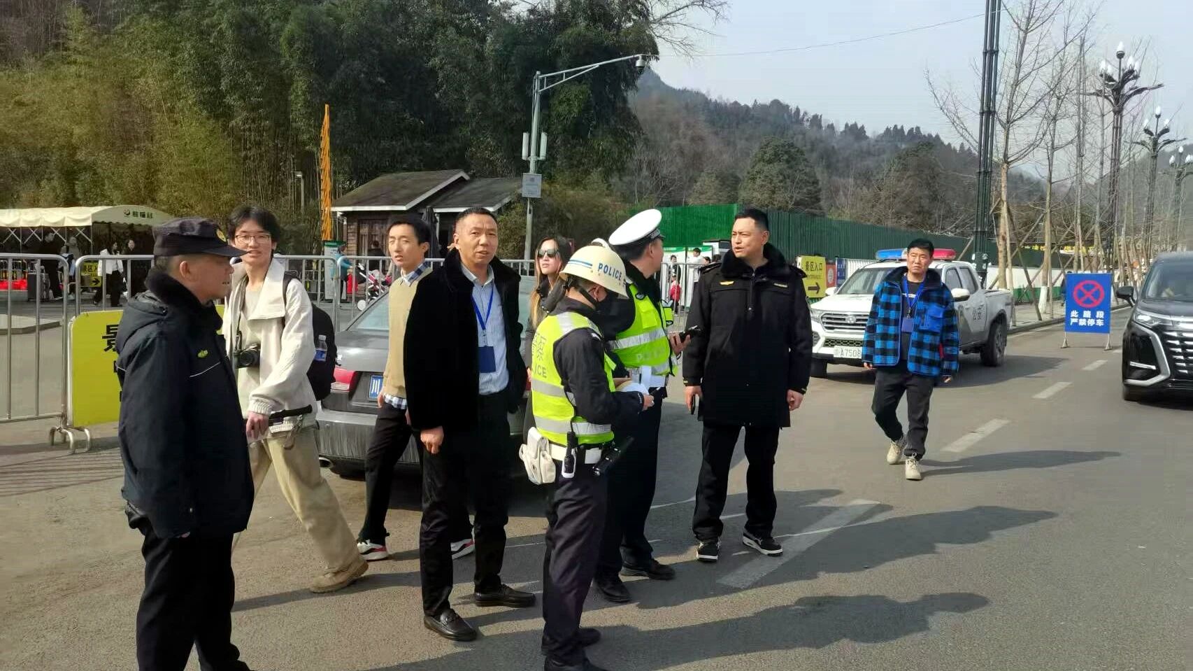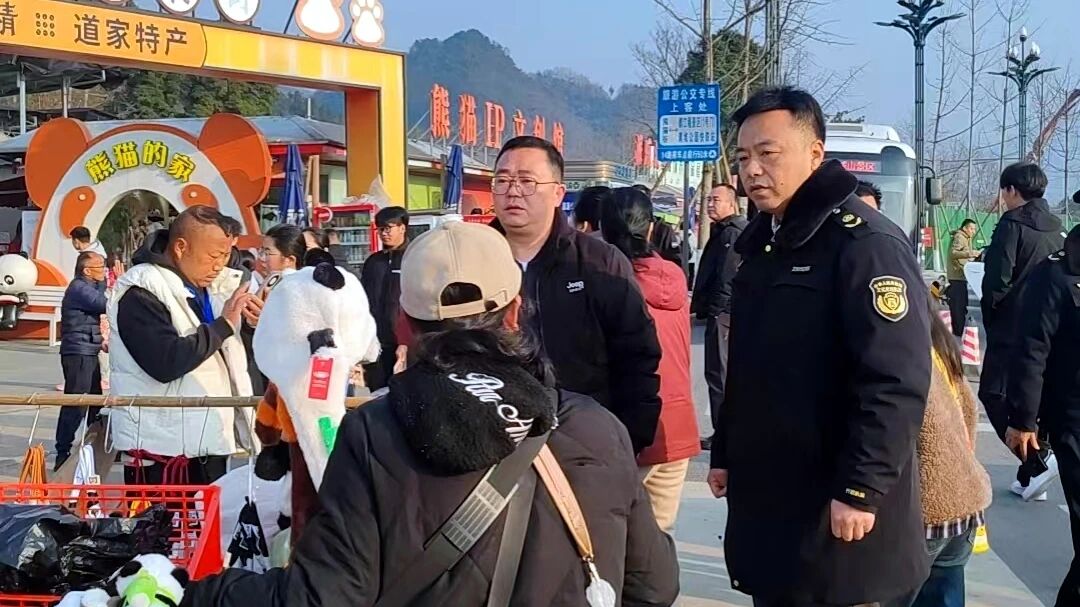 2月14日,都江堰熊猫谷景区入口处看到,联合执法组正开展黑导游专项整治。执法人员身着制服、佩戴执法记录仪,对上前搭讪揽客、无正规证件的人员逐一拦查核验,现场核对电子导游证、团队行程单与旅行社委派手续。并向围观游客讲解辨别黑导游、防范消费陷阱的提示。周边巡查组同步巡逻,对尾随揽客、散发违规小广告、诱导购物等行为即时制止。