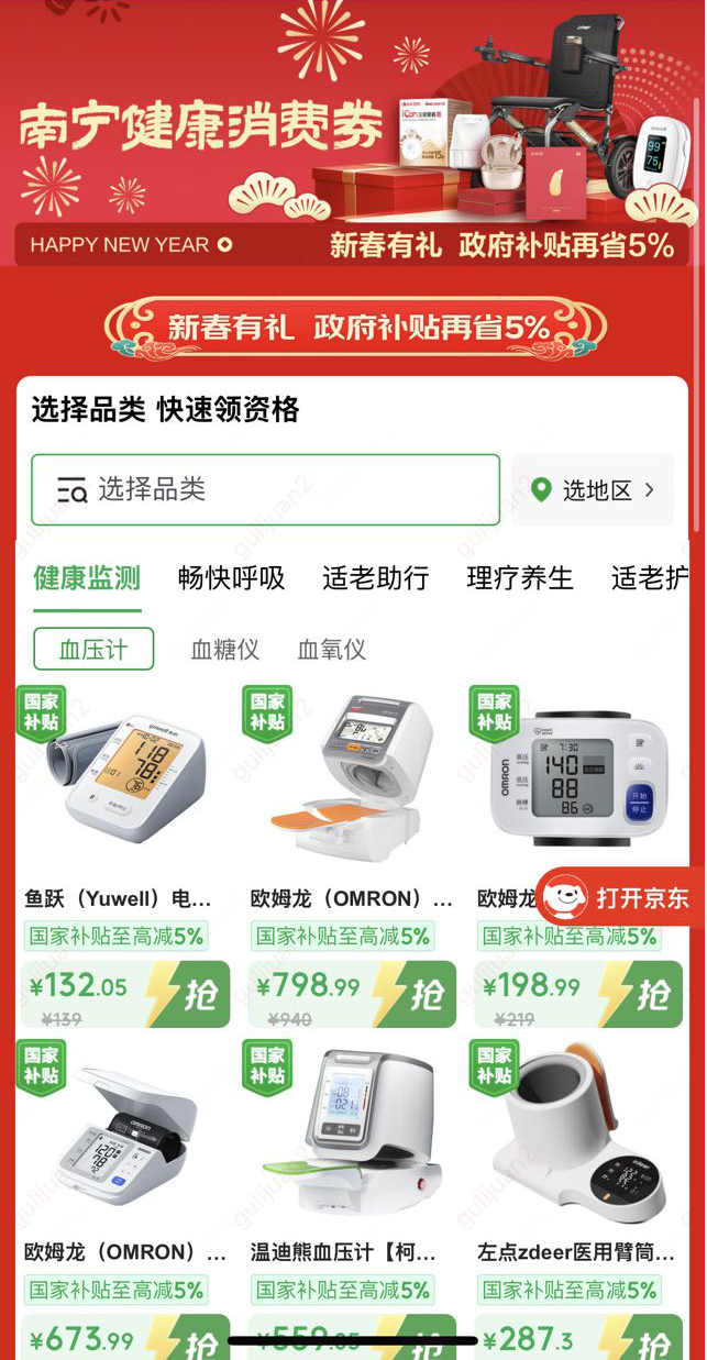 本次活动从2月14日持续至3月31日,全国消费者登录京东APP,搜索“南宁健康消费券”即可进入活动页面,领取5%-15%的健康消费券。无论是慢病管理所需的制氧机、血糖仪、血压计,还是家庭适老场景下的轮椅、助听器、护理床,亦或是日常防护用品、美瞳等医用美护产品,均可享受补贴优惠。活动期间,每笔订单最高可补贴2000元。值得一提的是,此次消费券计划不仅面向南宁本地市民,全国用户均可参与领取和使用。
