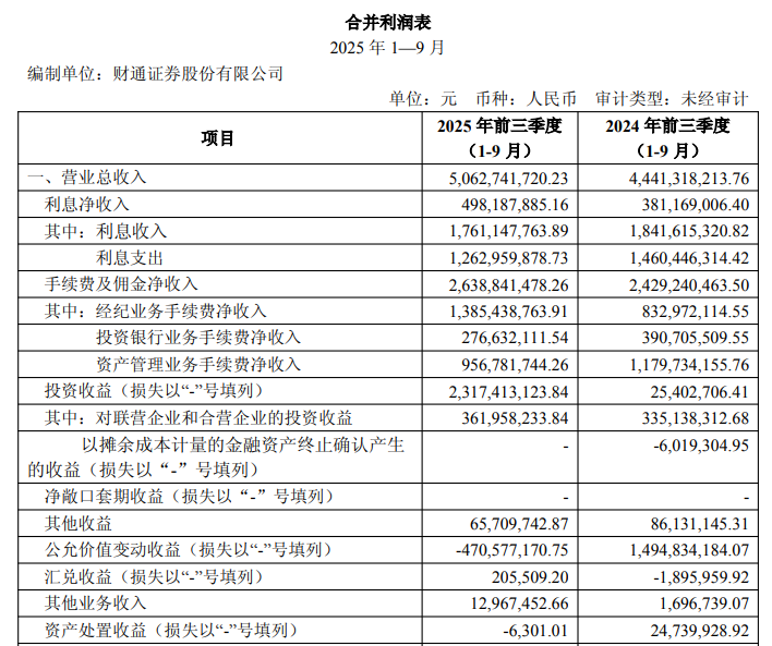业绩方面,财通证券呈现出“两极分化”的态势。2025年前三季度,公司交出了一份亮眼的成绩单,总资产1484亿元,同比增长4.65%;实现营业收入50.63亿元,同比上涨13.99%;归母净利润20.37亿元,同比暴涨38.42%。