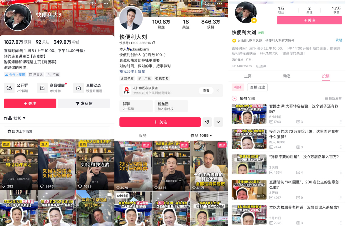 专注创业赛道的博主不少,比如对各行各业创业领域进行观察的“陈翔创业圈”“肖掌柜”“纯利小五郎”等,各平台粉丝数在几十万至几百万不等。还有深耕餐饮创业赛道的头部博主“比尔盖南”,目前抖音粉丝数已达1329.2万,快手粉丝数已达663.6万。与勇哥风格相近的是“快便利大刘”,简称大刘,同样是直播连麦回答关于选址、运营的问题,涉及的主要是便利店、小超市、零食店等商超门店,目前抖音粉丝数为349.0万,快手粉丝数为100.8万,B站粉丝数1.0万。