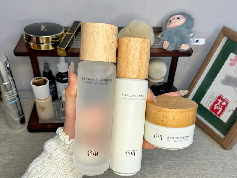 这套水乳的灵魂在于其独家自研原料——极光甘草。不同于普通的光甘草定,谷雨通过三大国家发明专利将其功效拉满: