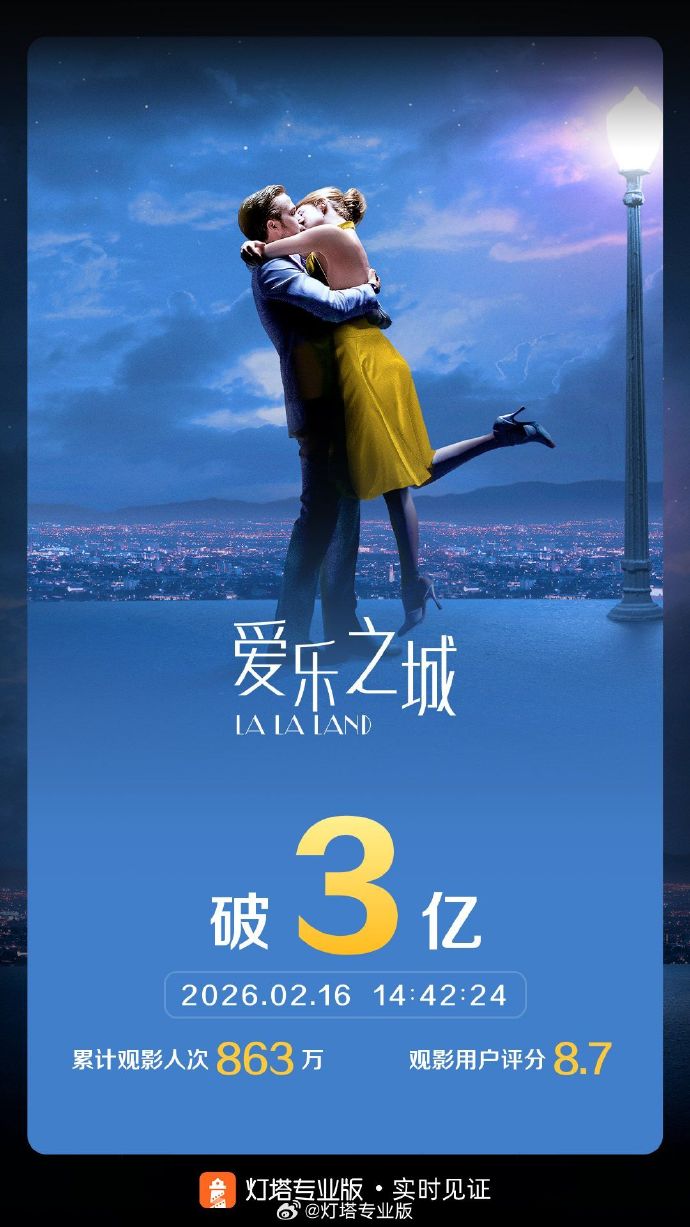 据灯塔专业版实时数据,截至2月16日14时42分,影片《爱乐之城》票房突破3亿。