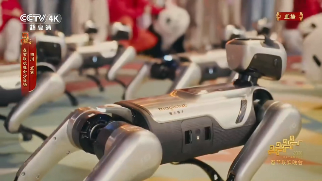 今晚春晚的宜宾分会场,直接来了上百只穿着熊猫外衣的魔法原子四足机器人MagicDog。一起动、一起停、一起转身,憨态可掬,十分逼真,未来“人手一只大熊猫”指日可待。