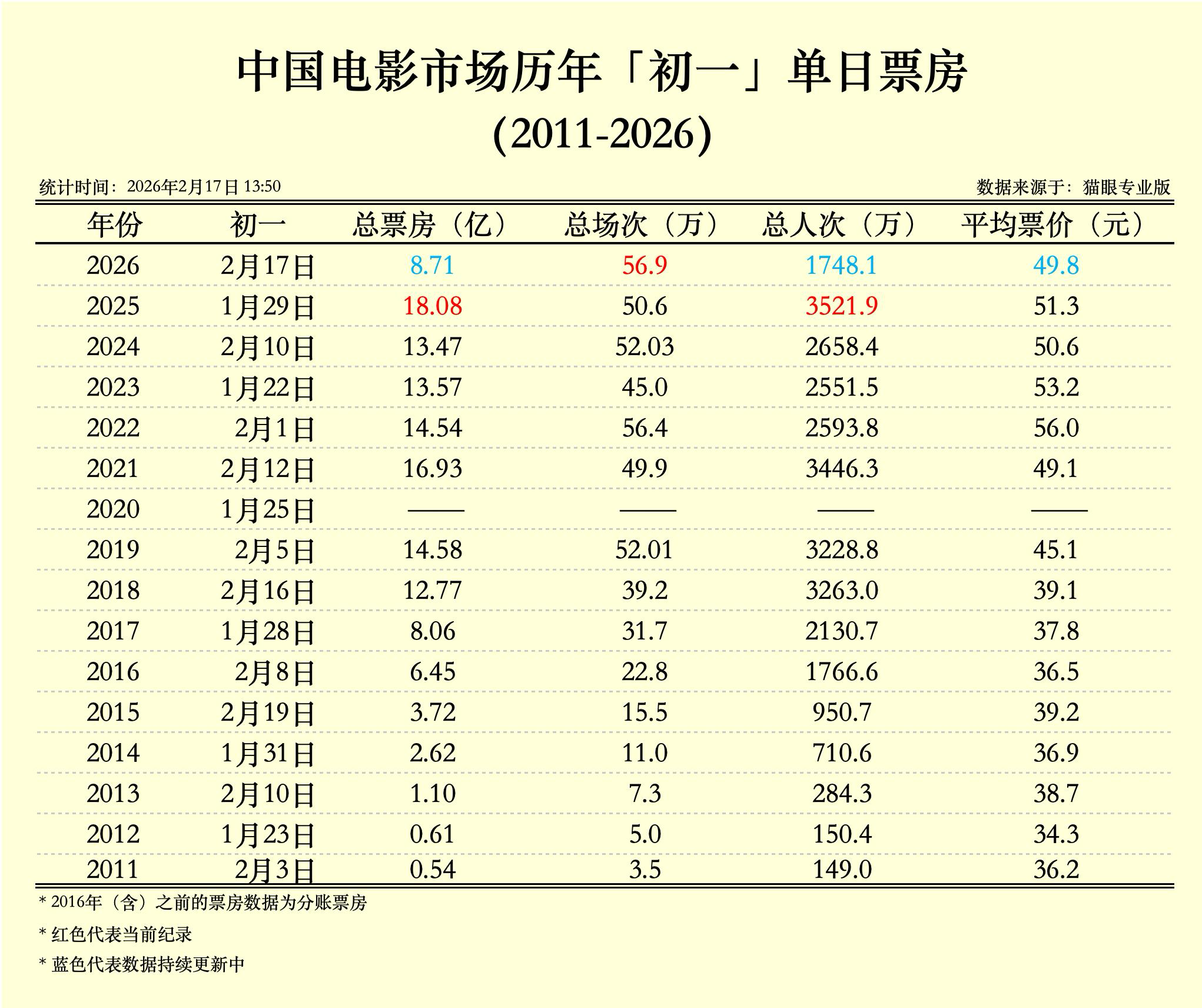 据猫眼专业版,2026年春节档首日票房12.33亿,同比下跌5.75亿,总人次2478.6万,同比下跌967.7万。唯一上升的数据只有总场次达到了57万,同比上升9万,刷新了中国影史大年初一场次纪录。